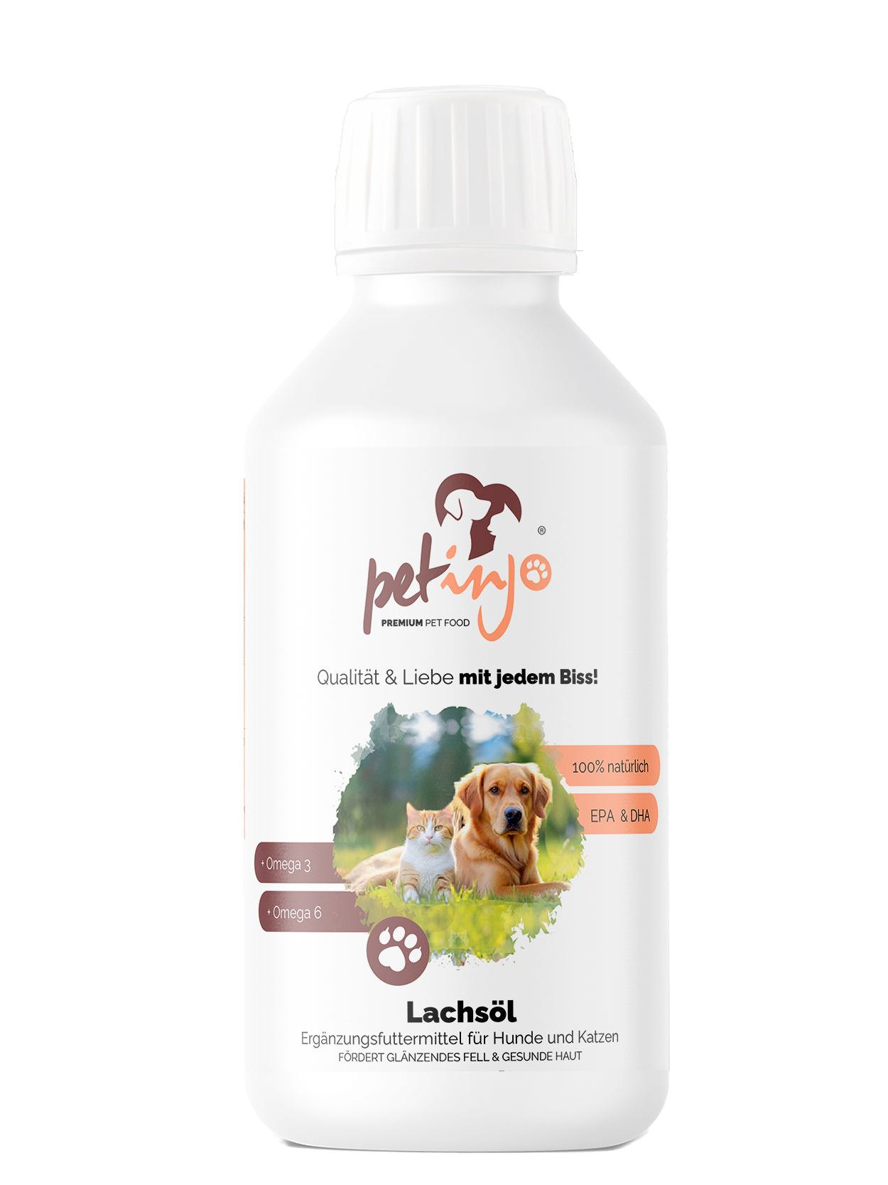 petinjo® Lachsöl versorgt dein Tier mit wertvollen Mikronährstoffen, wie Omega-3, Omega-6, EPA, DHA und ALA-Fettsäuren. Die lebenswichtigen Fettsäuren können vom Körper nicht selbst gebildet werden und müssen daher über die Nahrung aufgenommen werden.